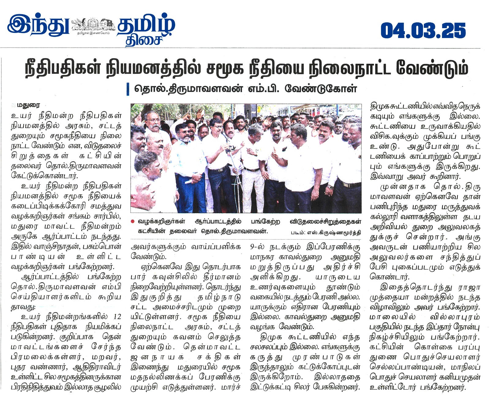 நீதிபதிகள் நியமனத்தில் சமூக நீதியை நிலைநாட்ட வேண்டும் தொல்.திருமாவளவன் எம்.பி. வேண்டுகோள்