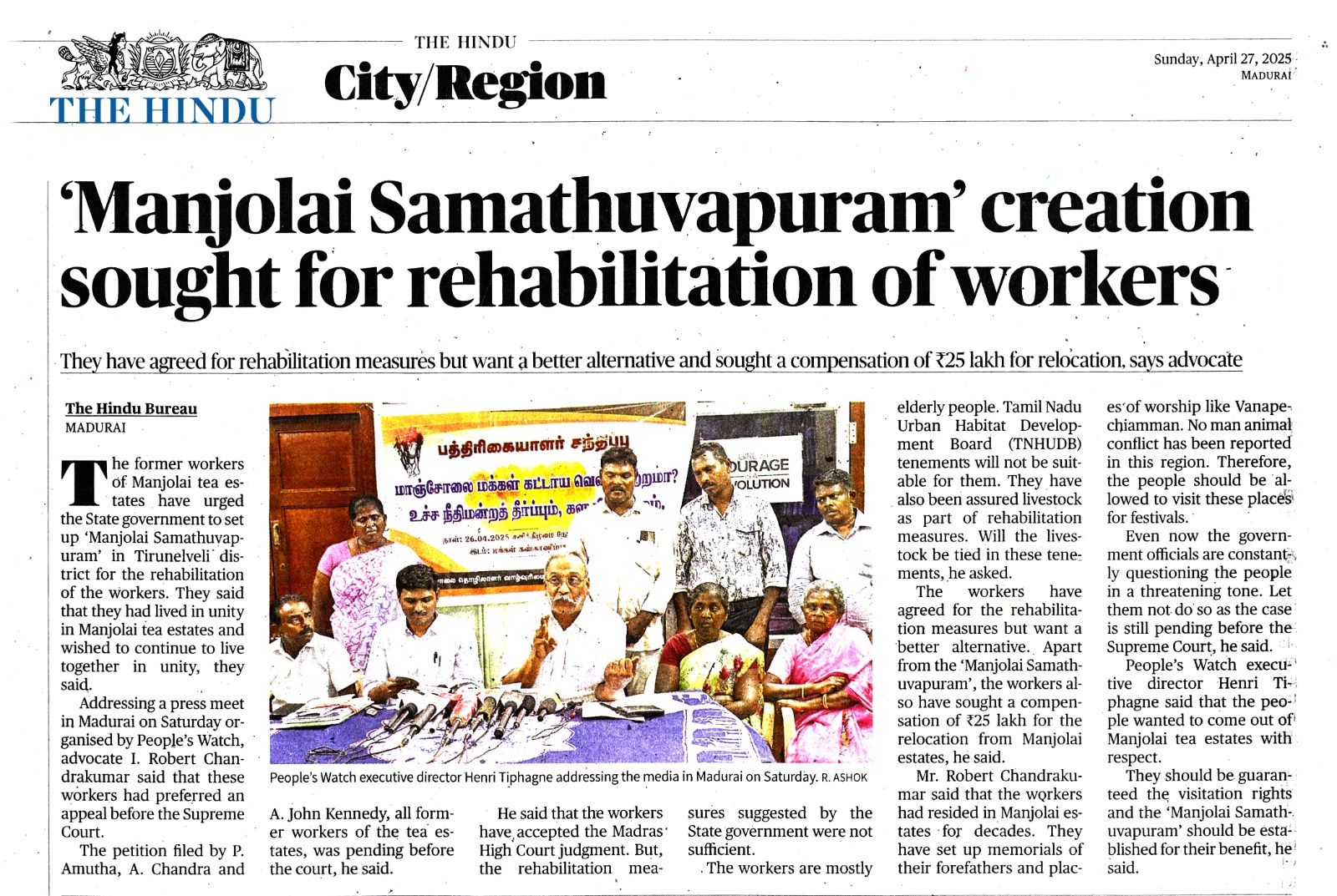"மலையில் சாதி, மதம் பார்க்காமல் வாழ்ந்த எங்களுக்கு சமத்துவபுரம்போல் குடியிருப்பு அமைத்துத் தரவேண்டும், உச்ச நீதிமன்றத்தில் வழக்கு உள்ள நிலையில், மலையிலிருந்து வெளியேற நிர்ப்பந்திக்கக் கூடாது" என்று மாஞ்சோலைத் தோட்டத் தொழிலாளர்கள் தெரிவித்துள்ளனர்".