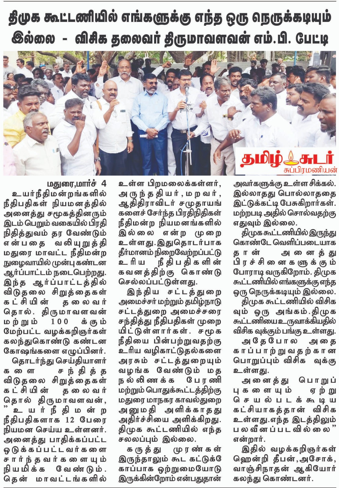 `திமுக கூட்டணியில் இருந்துகொண்டே அனைத்து பிரச்னைகளுக்கும் விசிக தொடர்ந்து குரல் கொடுத்து வருகிறது. கூட்டணியில் விசிக-வுக்கு எந்த நெருக்கடியும் இல்லை.' – திருமாவளவன்