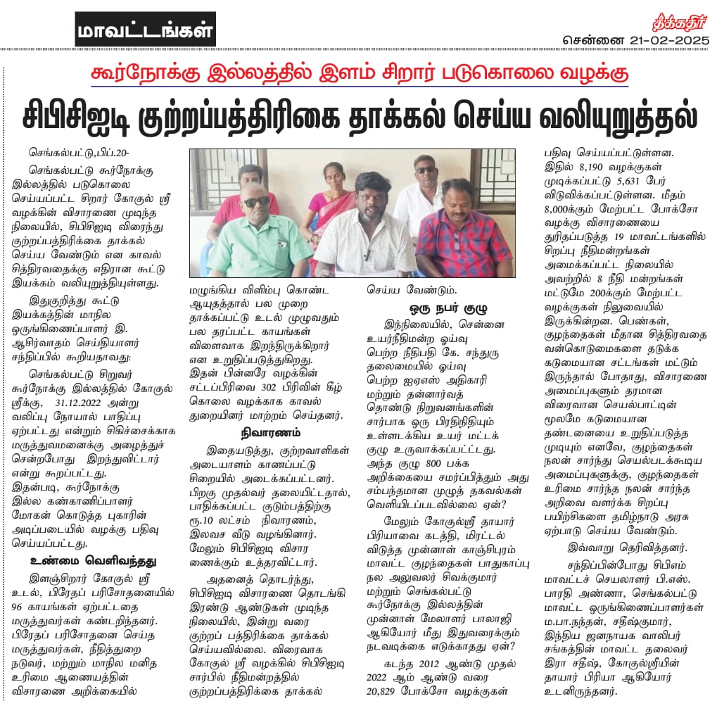 சாத்தான்குளம் காவல் சித்திரவதையை விட கொடுமையான 96 கொடூர காயங்களுடன் செங்கல்பட்டு அரசினர் சிறுவர் கூர்நோக்கு இல்லத்தில் 31.12.2022 அன்று 17 வயது சிறுவன் கோகுல்ஸ்ரீ மரணம் குறித்து, அவனது அம்மா பிரியா 27.03.2023 அன்று பத்திரிகையாளர் சந்திப்பில் தெரிவித்த அதிர்ச்சி தகவல்கள்..